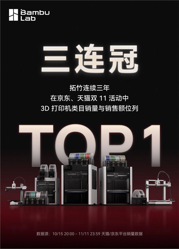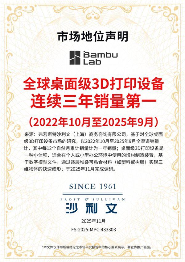 不仅如斯,拓竹还在京东包揽 3D 打印确立热卖榜前十、在天猫包揽 3D 打印机热卖榜 & 3D 打印机好评榜前三席位。而近期,具有长达 60 多年的国际巨擘性增长琢磨机构 —— 弗若斯特沙利文 (Frost &Sullivan) 也发布最新数据示意,拓竹全球桌面级 3D 打印确立邻接三年 (2022 年 10 月至 2025 年 9 月) 销量第一。